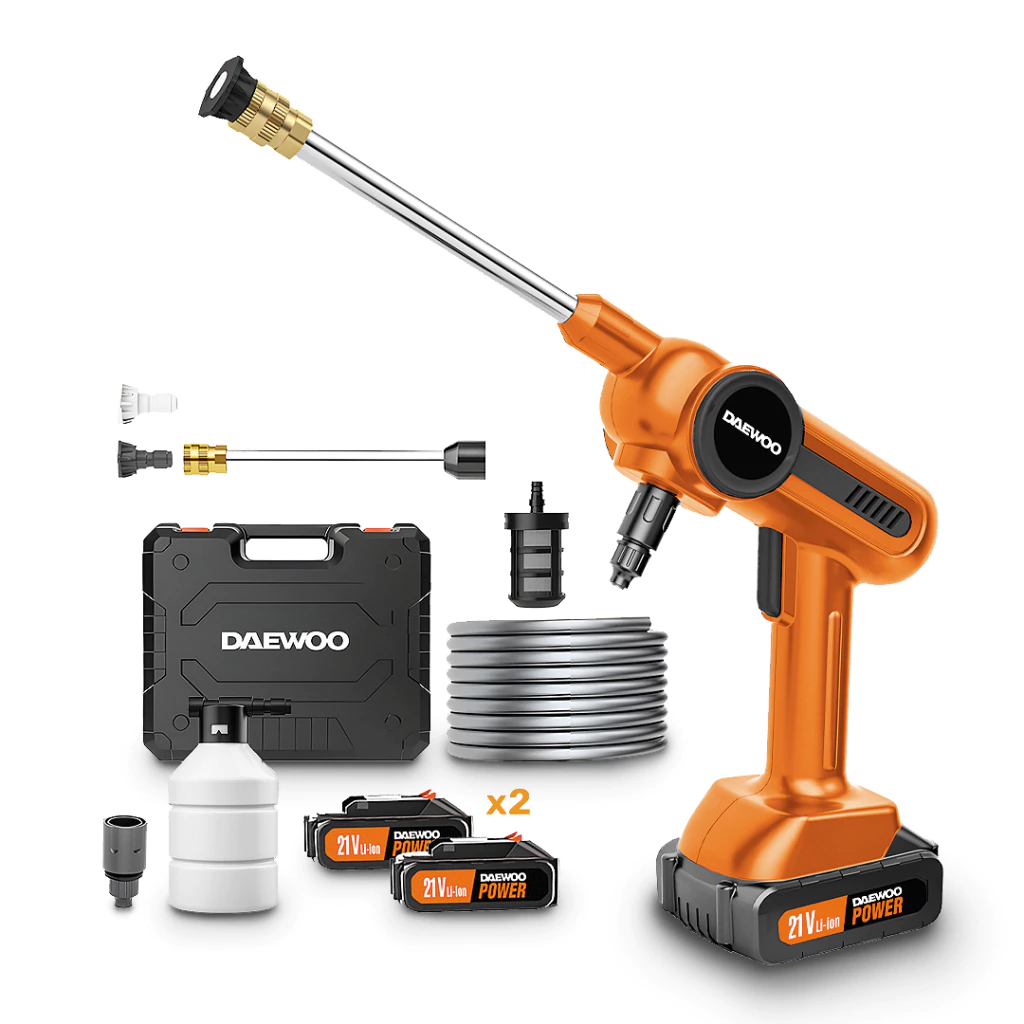 Esta hidro lavadora inalámbrica cuenta con una batería recargable de litio de 21V que genera una presión de trabajo máxima de 100 PSI y una autonomía de hasta 30 minutos. Incluye un kit de lavado a presión completo con dispensador de jabón, boquillas de 0° y 40° para diferentes patrones de rociado, ajustables girando la cabeza del dispositivo.