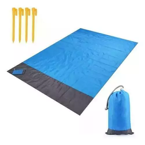 Lona para la playa o la pileta impermeable, super liviana (340gr), trae un bolso para poder guardarla y que ocupe poco espacio, también incluye 4 estacas plásticas para que no se te escape.