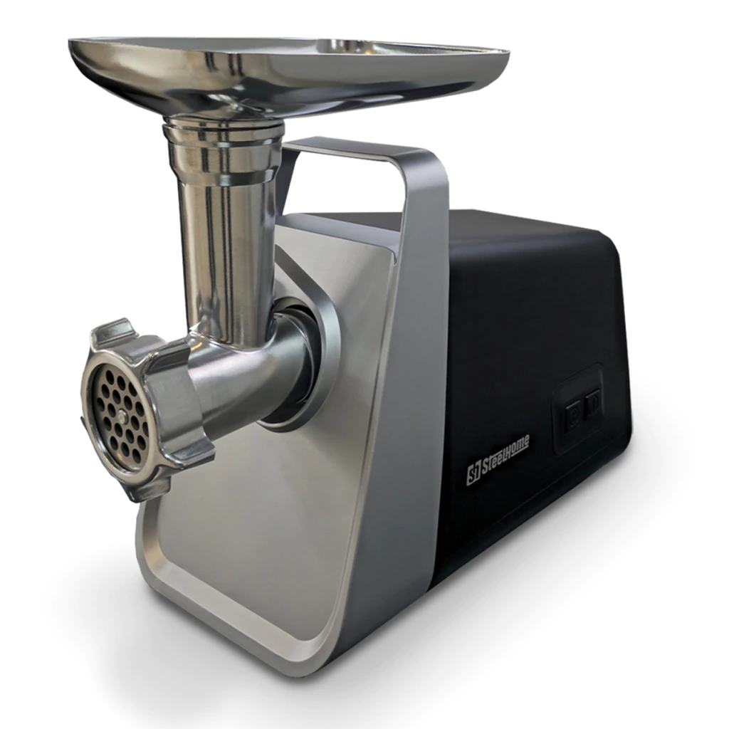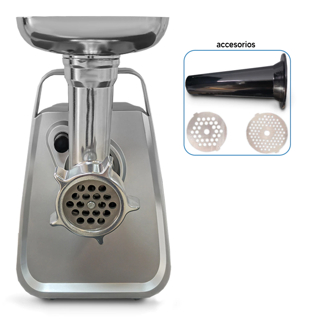 Picadora y embutidora de Carne Steel Home Linea Marsella. Su diseño en acero inoxidable no solo garantiza duravilidad, sino que tambén asegura una limpieza fácil y un aspecto elegante en tu cocina. Equipado con tres discos intercambiables, este modelo ofrece versatibilidad, para obtener diferentes texturas en tus preparaciones. Ya sea que desees carne picada fina para hambuerguesas o más gruesa para guisos. Su funcionamiento silencioso y eficiente la convierte en una opción perfecta para cualquier hogar.