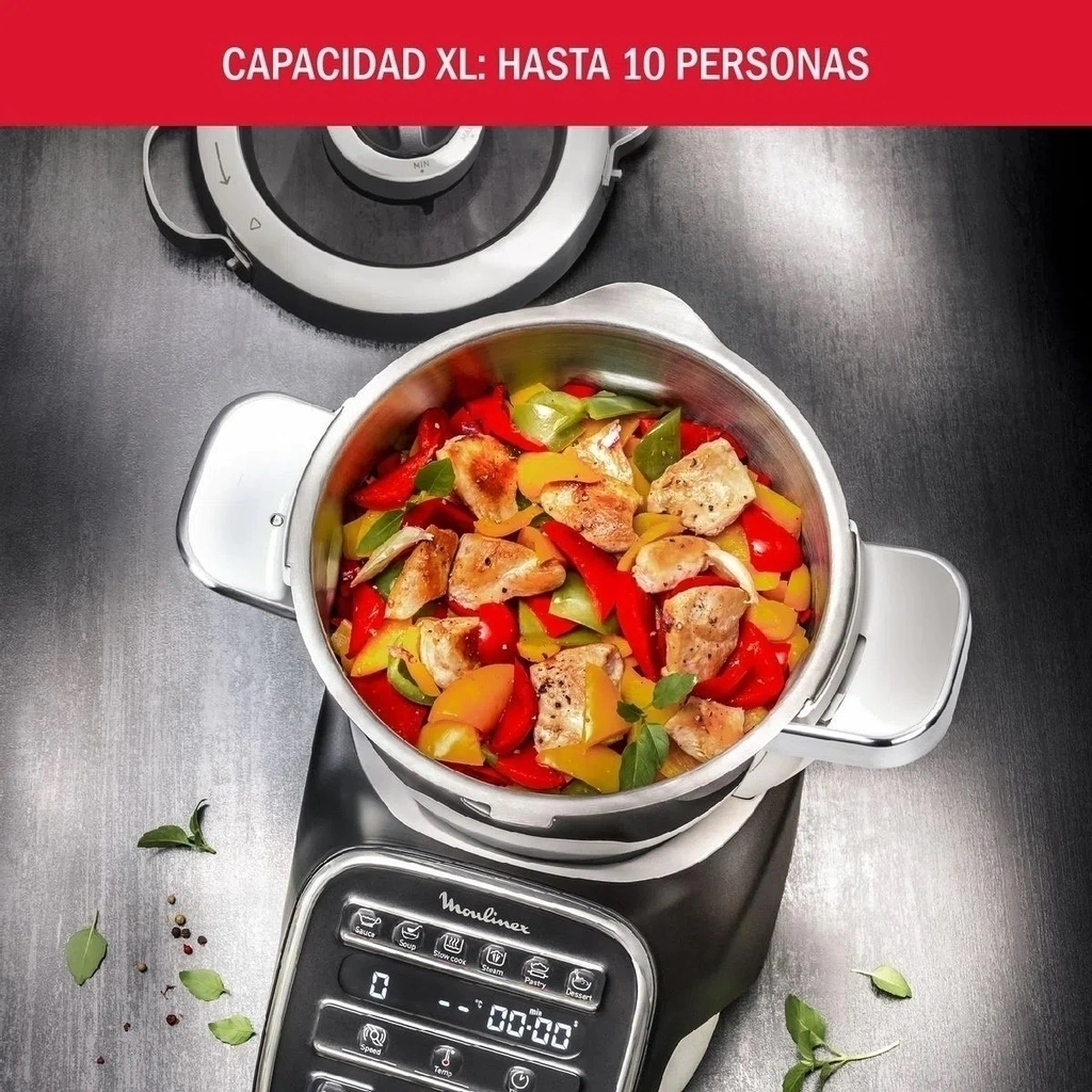 Robot Cocina Moulinex HF809820 Companion XL Procesa, prepara y Cocina. Capacidad 3 Litros (Hasta 10 raciones). 1550 W.de potencia. 6 Funciones (Salsas, sopas, cocción lenta, cocción al vapor, masas y postres ). 5 Accesorios ( Vaporera, Batidor, Cuchilla Trituradora, Emulsionador, Amasador )
