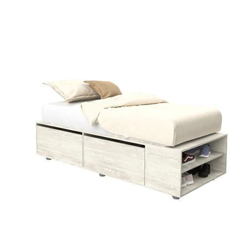 Sommier Box 1 plaza Delos DLD06pc. Con un diseño compacto y funcional, este modelo ofrece practicidad sin ocupar demasiado espacio. Cuenta con 2 puertas basculantes laterales y un estante en la piecera, que brindan espacio de guardado adicional.