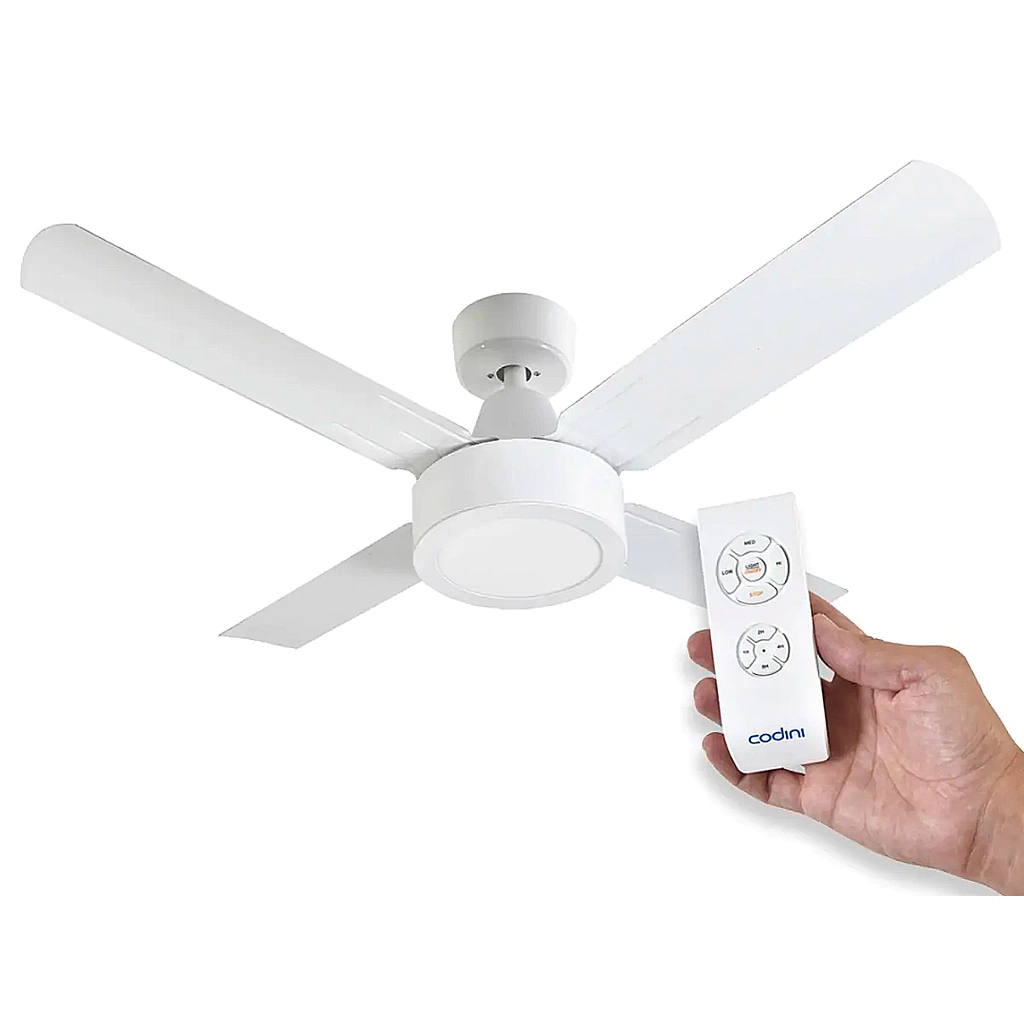 El ventilador de techo Codini v5rb tiene un diseño moderno y sofisticado, con 4 palas de metal color blanco y una luminaria LED de 22 cm de diámetro. Además, cuenta con un control remoto que te permite ajustar la velocidad, el temporizador y el encendido o apagado del ventilador y la luz.